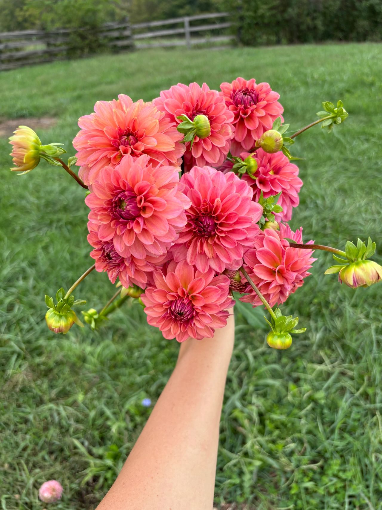 Cornel is a ball form dahlias. These last a long time cut and in a vase. Cornel grows tall and produces abundantly. You can see here how tall one of the budding stems is behind me, and I'm 5'9 on a good day. I love cornel for fall bouquets. The moody jewel tone would be the perfect addition to your garden. It's almost a red but also burgundy. I love it!